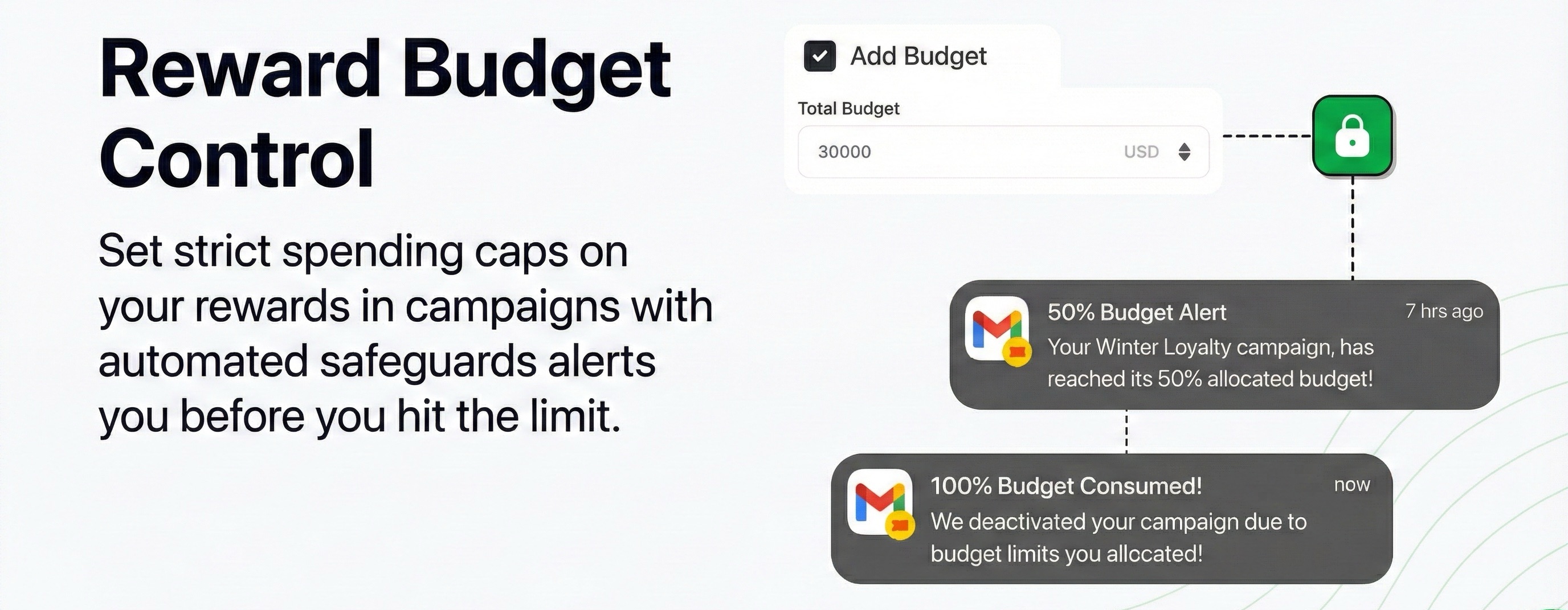 The system includes built-in safeguards that protect your business: campaigns automatically stop once 100% of the budget is reached, alerts notify teams at 50%, 80%, and 100% spend thresholds, budgets cannot be lowered below what's already been issued or spent, and historical spend is preserved accurately without retroactive changes. Even when campaigns end, tracking continues—ensuring issued rewards that redeem later are still accounted for.