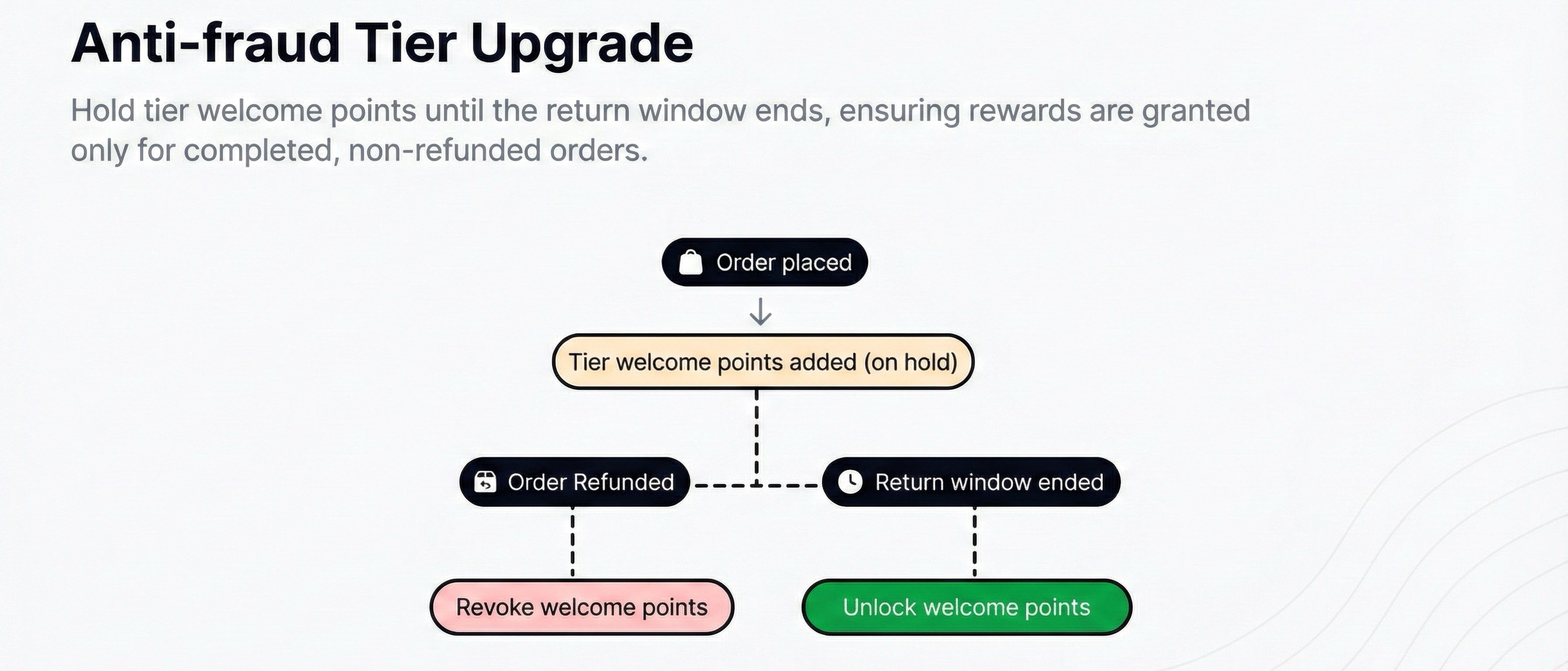 Here's how it works: when a customer places an order that triggers a tier upgrade, welcome points are added on hold. If the order is refunded, points are revoked. Once the return window ends, points are unlocked. Rewards are only granted when the order is genuinely complete.