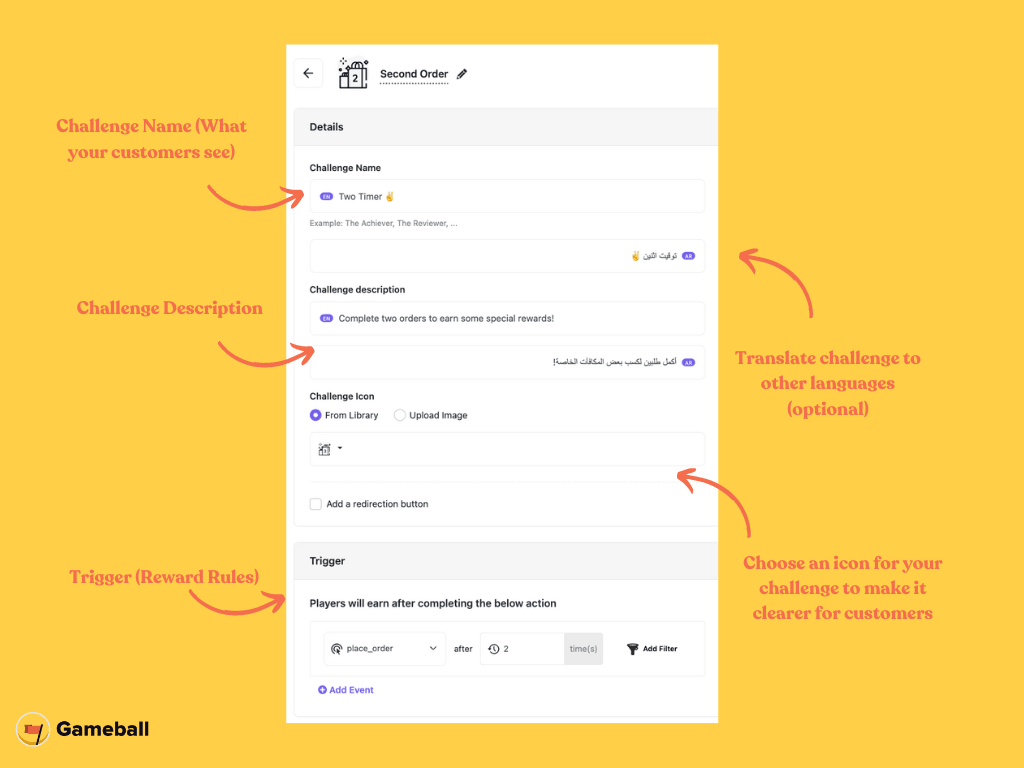 As we mentioned, the goal is to motivate customers to make a second order. As we learned from Starbucks’ example, one of their best-performing loyalty tactics is rewarding customers after their purchases.We want to do the same. So when someone buys one of our pastries, we want to encourage them to either buy it again or try something else in a specific time window. In the Gameball dashboard, this falls under “Retain” and is very simply set as “Second Order.”
