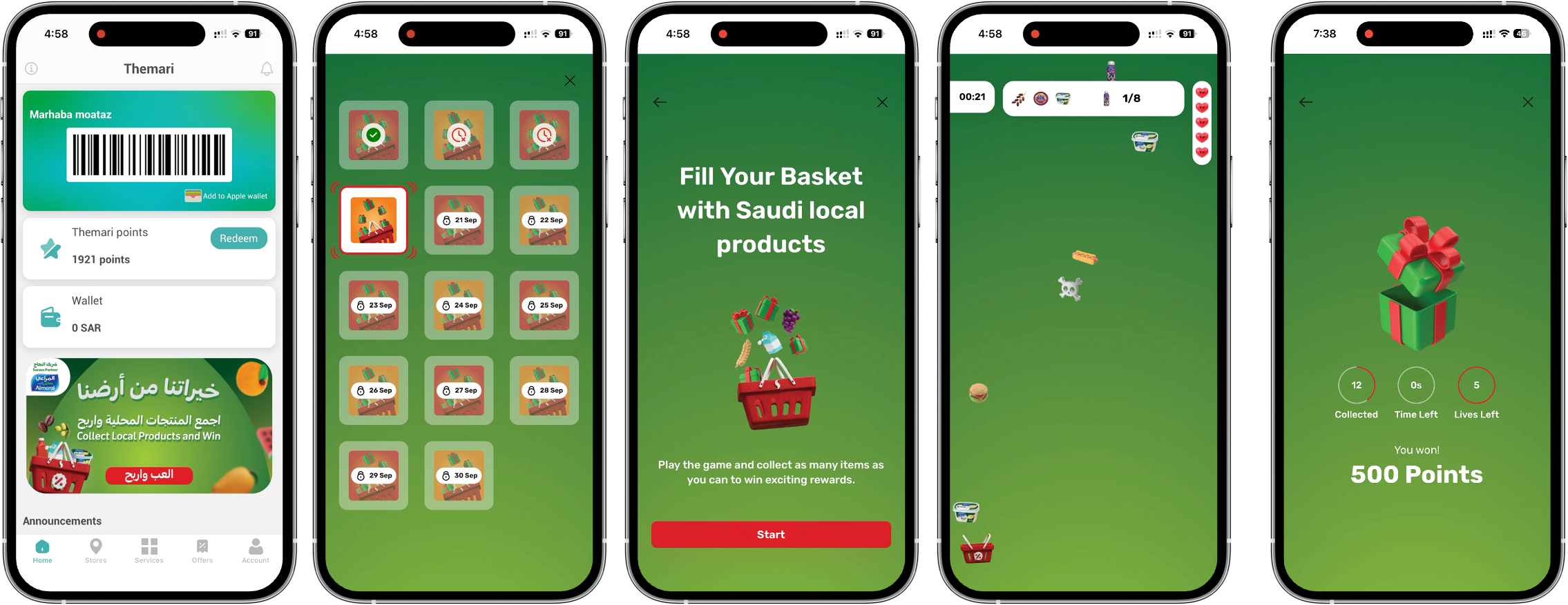 - Catch & Collect Game: Timed in-app challenge where shoppers collect branded product icons for instant rewards. Used for Almarai co-sponsored Saudi National Day campaign.