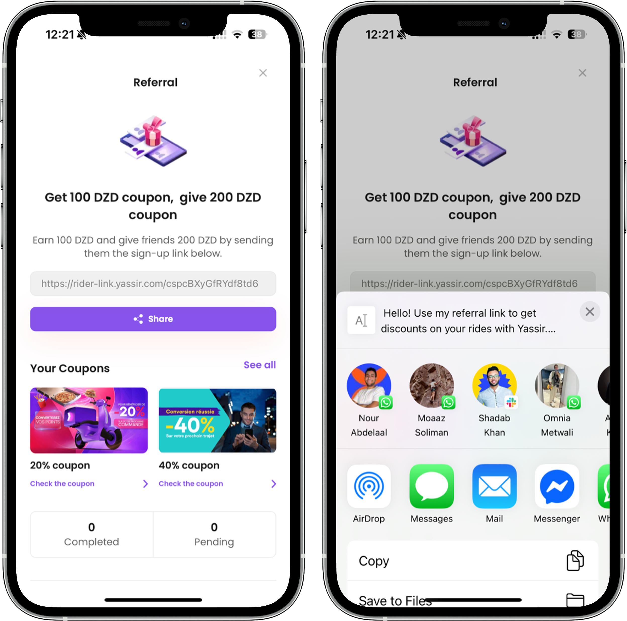 Existing users earn 100 DZD coupons for referring friends, while new users receive 200 DZD to try the service. Referral links are shareable through AirDrop, Messages, Mail, Messenger, WhatsApp, and more—meeting users wherever they already communicate.
