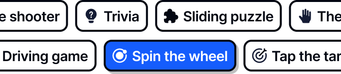 Customizable games to meet goals like activating customers, increasing downloads, or engaging visitors. Options include luck-based games like Spin the Wheel and skill-based games like The Catcher.