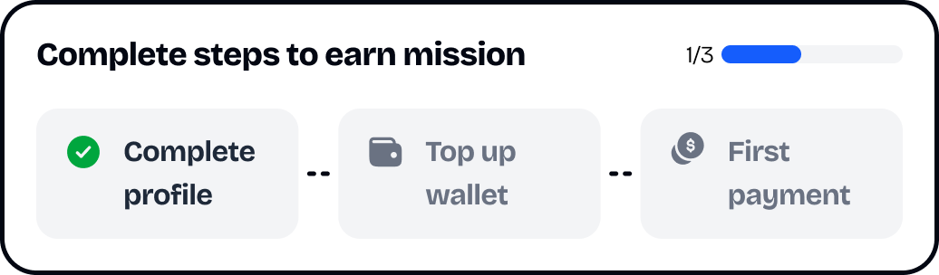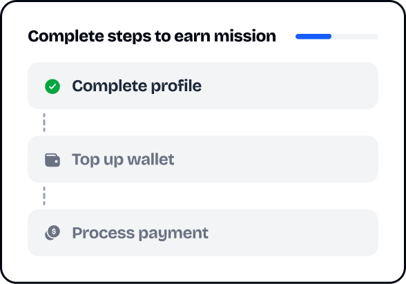 Activate customers throughout their journey with simple and easily achievable missions like profile completion, first transaction, wallet top-ups, referring a friend and more.