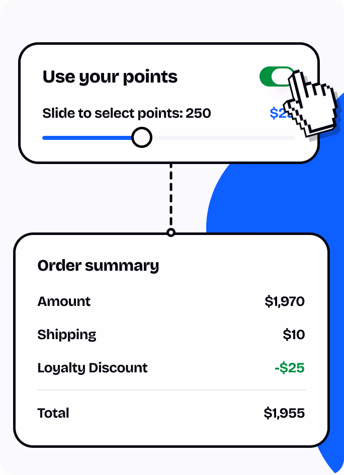 Let customers choose how many points to redeem instantly at checkout, through coupons, or in catalogues, all via your UI or Gameball’s time-saving widget.