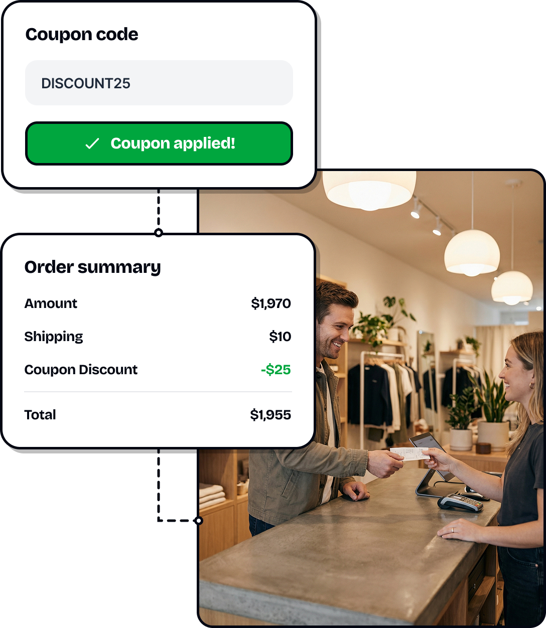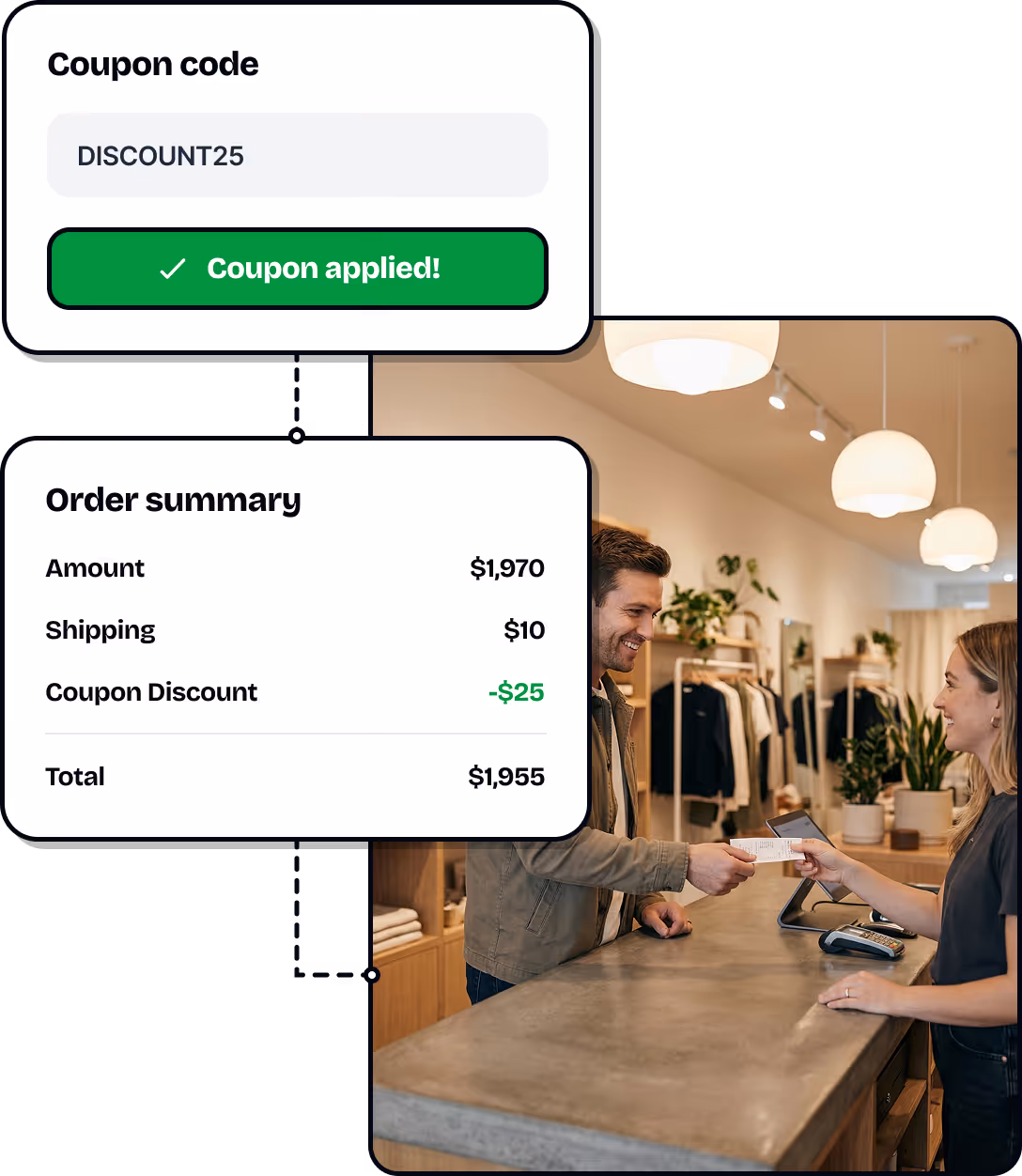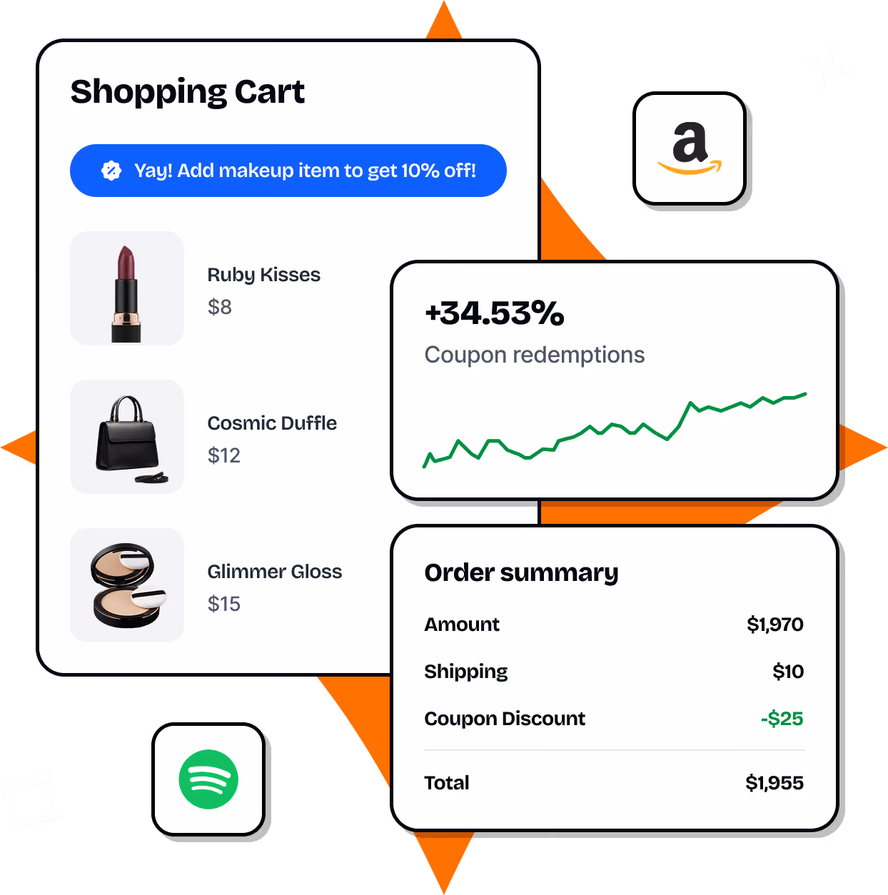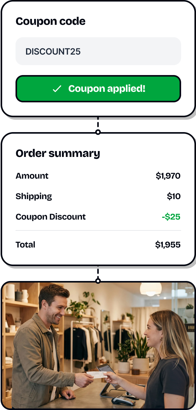 Coupons auto-apply at checkout or sync with your order API—zero manual work.