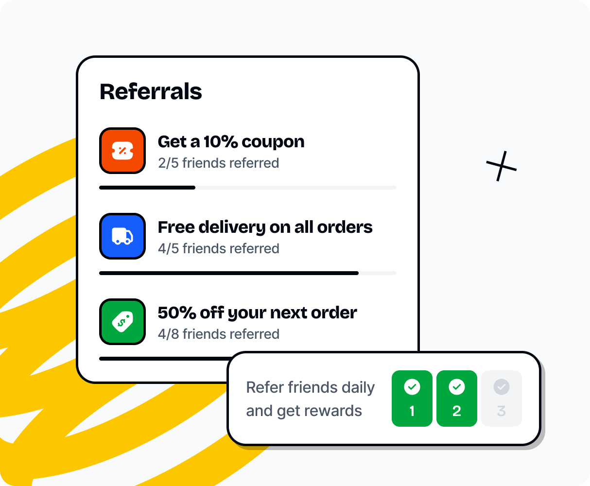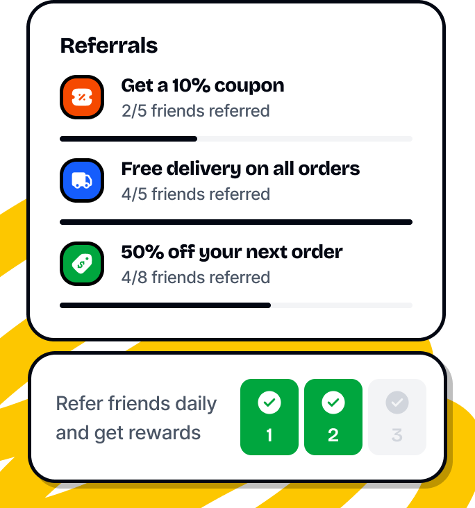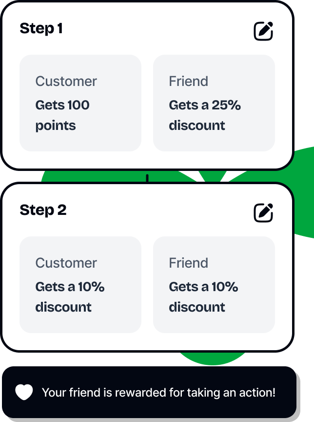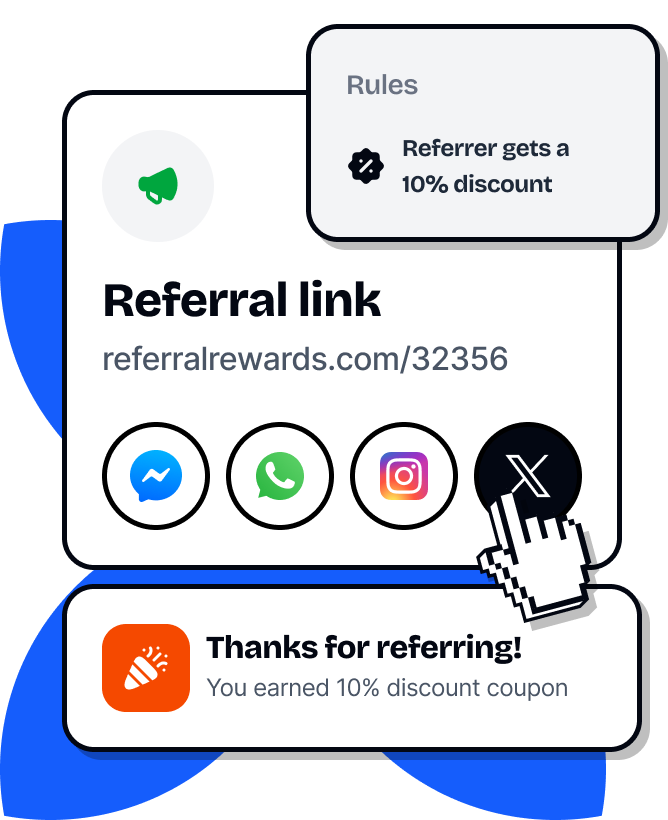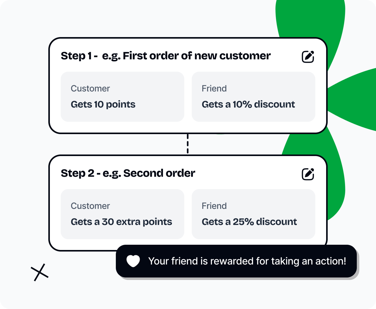 Give the referrer and referee different rewards — cashback, points, discount codes, you name it. You set the rules.
